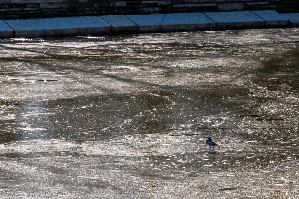 氷の上を鳥がなんか探しているけど、ここにはエサはないと思う。